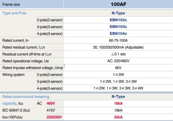 Thông số kỹ thuật của Aptomat ELCB EBN104c 4P 30A 30mA và 100/200/500mA 18kA LS
