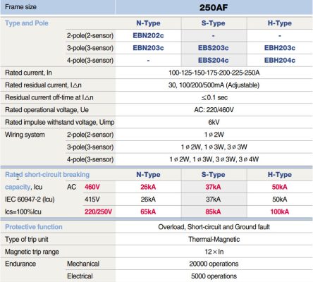 Thông số kỹ thuật của Aptomat ELCB EBN203c 3P 200A 30mA và 100/200/500mA 26kA LS