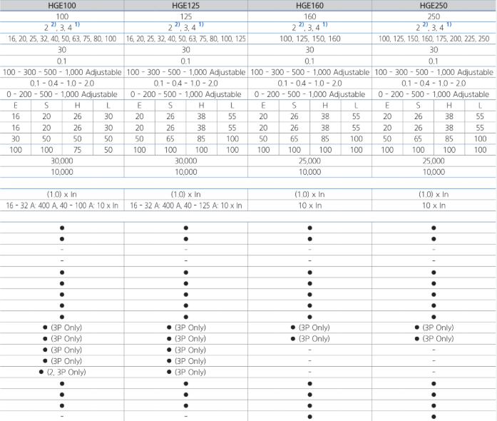 Thông số kĩ thuật của Aptomat ELCB HGE100S 3P 100A 20kA Hyundai :