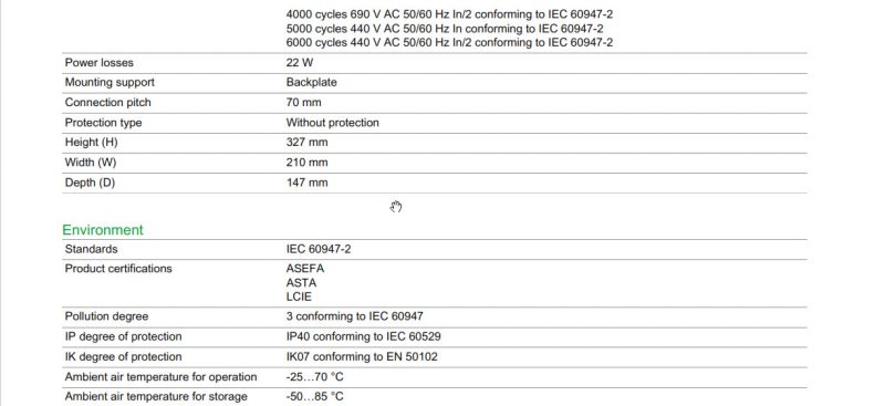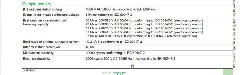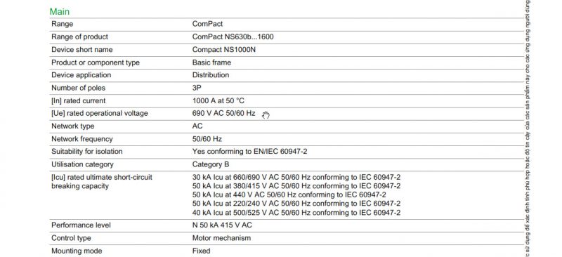 Thông số kỹ thuật của Aptomat MCCB 3P 1000A 50kA Compact NS1000N Schneider