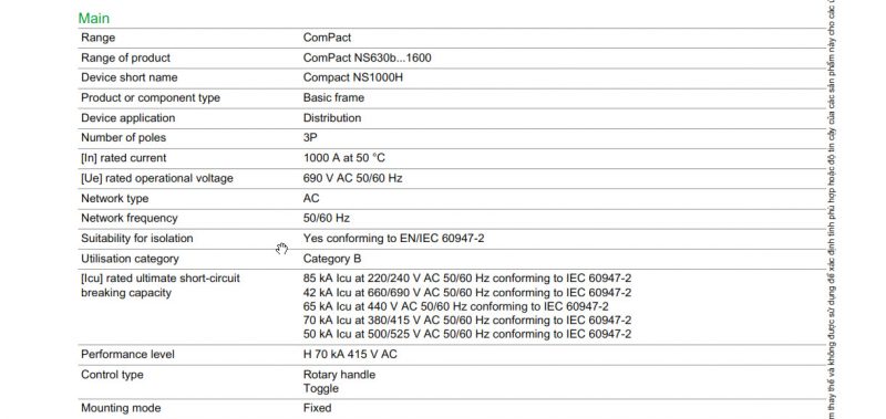 Thông số kỹ thuật của Aptomat MCCB 3P 1000A 70kA Compact NS1000H Schneider