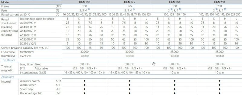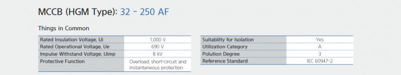 MCCB HGM250S-F là át chỉnh dòng nhiệt (Adj. thermal) dải điều chỉnh (0.8-0.9-1*In), chịu quá tải tốt, khả năng đóng cắt cao, độ bền cơ khí tới 25.000 lần đóng cắt. Dòng thiết kế đạt 100% dòng định mức (Ics = 100% Icu)