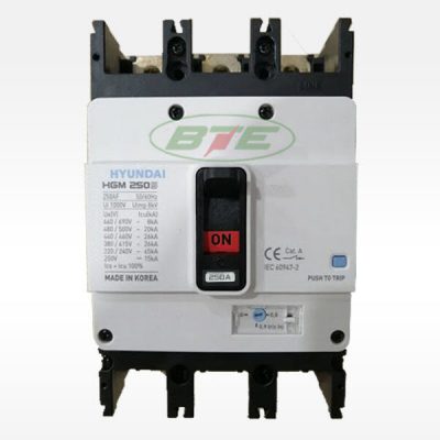 Aptomat MCCB HGM250S-F 3P 250A 26kA Hyundai là biết bị đóng cắt dạng khối, 3 pha, có chức năng đóng cắt điện, bảo vệ các phụ tải phía sau aptomat như bảo vệ quá tải, ngắn mạch (Nhiệt & từ).