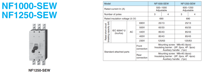 Thông số kỹ thuật của Aptomat MCCB NF1000-SEW 3P 1000A 85kA Mitsubishi