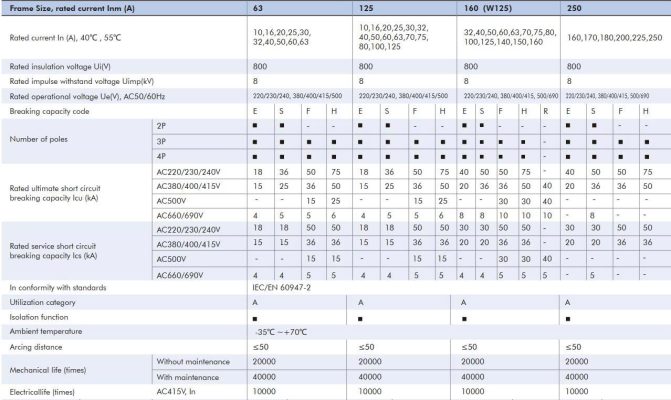 - Service breaking capacity (Icu/Ics): 50/36kA tại điện áp 380/415V