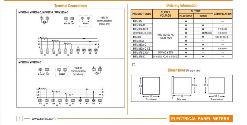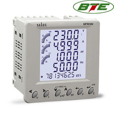 Đồng hồ đo đa chức năng MFM384C Selec là đồng hồ đo dạng điện tử, màn hình LCD 4 hàng 4 số, được sử dụng rất phổ biến trên thị trường, đo đa năng được V, A. Hz, Pf, kW, kVA, kVAr, kWh, kVArh, kVAh và đo kWh, kVAh, kVArh và thêm chức năng: đo, hiển thị sóng hài THD của điện áp, dòng điện.