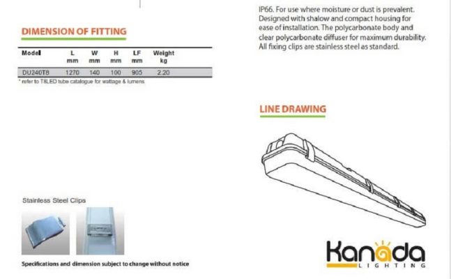 Máng đèn chống ẩm 2 bóng DU240 T8 Kanada với chuẩn IP65, được sử dụng phổ biến trong môi trường khắc nhiệt, chống chịu được ẩm. Bóng sử dụng kèm theo là loại T8, 1.2m.