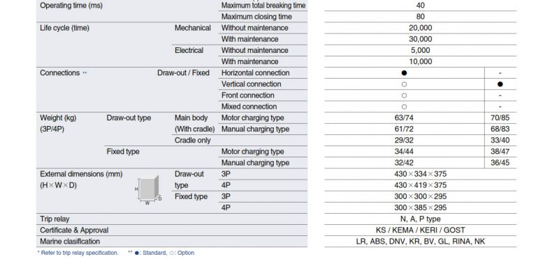 - Có bảo trì: Độ bền cơ khí tới 30.000 lần đóng cắt, điện là 10.000 lần đóng cắt khi có bảo trì. Trường hợp không bảo trì thì độ bền cơ khí là 20.000 lần đóng cắt, độ bền điện là 5.000 lần đóng cắt.
