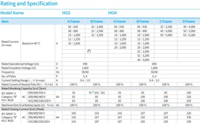 Bảng giá, Catalog của ACB HGS/HGN 630~2000A Frame A Hyundai: