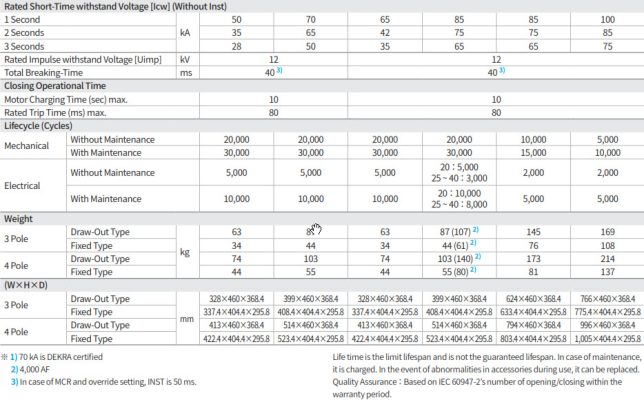 - Có bảo trì: Độ bền cơ khí tới 30.000 lần đóng cắt, điện là 10.000 lần đóng cắt. Trường hợp không bảo trì thì độ bền cơ khí là 20.000 lần đóng cắt, độ bền điện là 5.000 lần đóng cắt.