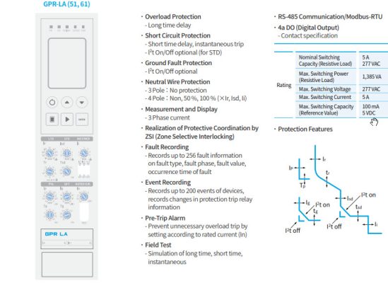 Máy cắt HGS10A 4H M0C0S051J 4P 1000A 65kA là máy cắt dòng tiêu chuẩn, đã có Rơ le GPR-LA (bảo vệ LSIG) tích hợp màn hình LCD và truyền thông MODBUS (Chưa bao gồm Mô tơ nạp, cuộn đóng, cuộn cắt, cuộn bảo vệ thấp áp) với đầy đủ các chức năng bảo vệ chỉnh định cụ thể.