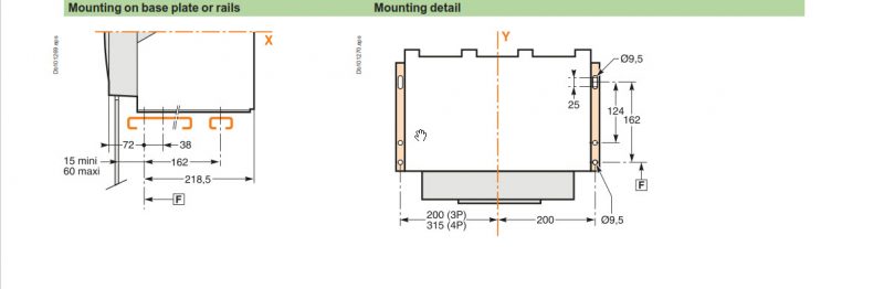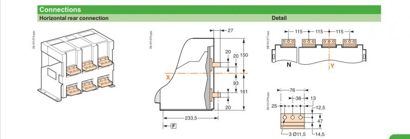 Kích thước và cực kết nối của Máy cắt ACB NW12H13F2 3P 1250A 65kA loại cố định Schneider
