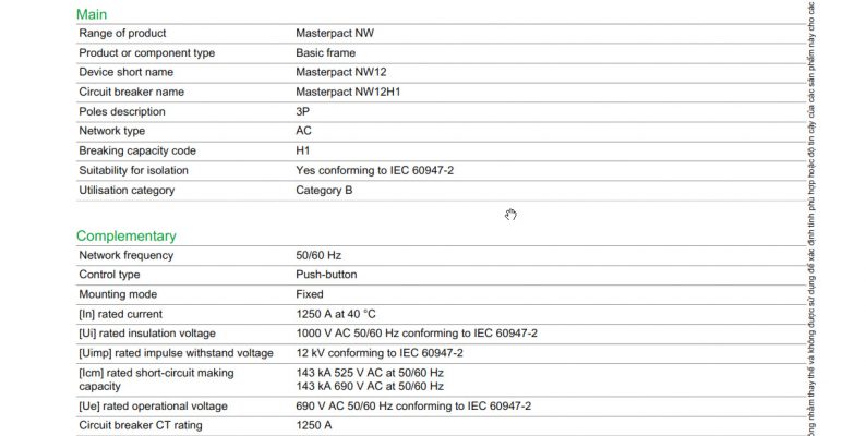 Thông số kỹ thuật chi tiết của ACB 3P 1250A 65kA NW12H13F2