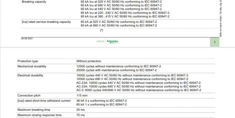 - Tiêu chuẩn: IEC 60947-2, Ics = 100% Icu