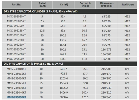MMB-235050KT là tụ bù điện áp 230VAC, hay dùng trong các tủ tụ bù của khách hàng Nhật Bản, được sử dụng kết hợp cùng với cuộn kháng điện áp 230V 7%,14% để bù công suất phản kháng, lọc sóng hài.