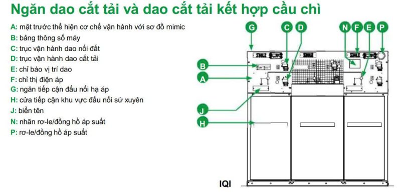 - Cấu hình: NE-QI, 2 ngăn không mở rộng, 1 ngăn cầu dao phụ tải đầu vào (I) và 1 ngăn cầu dao phụ tải kèm cầu chỉ bảo vệ máy biến áp (Q)
